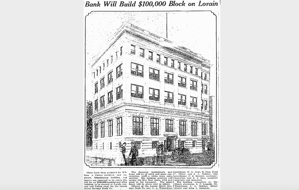 In 1919, the new Lorain Street Savings Bank building, four-stories tall and with a raised basement, opened on the northeast corner of Lorain and Fulton. It replaced the three-story building on that corner built for George Tinnerman's hardware and stove store. With the erection of this building on this corner, there were, as of that year, impressive four-story commercial buildings standing on both the northeast and southeast corners of Lorain and Fulton. The above sketch of the bank building was drawn by architect William J. Carter. | Source: Cleveland Public Library, Digital Newspaper CollectionDownload Original File