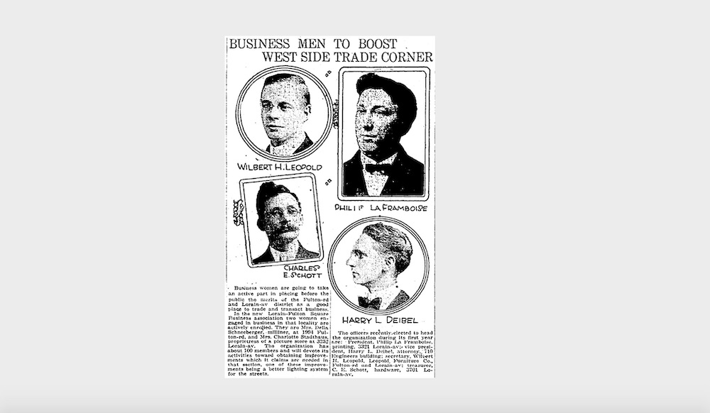 In 1915, businessmen with stores on or near the intersection of Lorain and Fulton formed a corporation to advance their mutual business interests in this area of the west side. The incorporators included representatives of families who operated businesses either on or near the intersection, including Henry Leopold's son Wilbert, and Charles Schott, the son of Emil Schott, a German immigrant who owned a hardware store on Lorain near the southwest corner of the intersection. The above article, which appeared in the Plain Dealer on February 24, 1914, notes that the association already had approximately 100 members, including two women, one of whom operated a millinery shop on the northwest corner of the intersection at 1994 Fulton. A number of the members of the new business association, like Wilbert Leopold, represented a second-generation of German-American merchants who were now principals in many of the commercial businesses located on or near Lorain-Fulton Square. | Source: Cleveland Public Library, Digital Newspaper CollectionDownload Original File