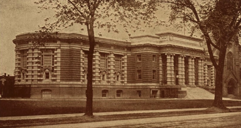 In addition to the larger and grander commercial buildings going up at the intersection of Lorain and Fulton in the late nineteenth and early twentieth centuries, another sign of the importance of this intersection to Cleveland, and particularly to the city's west side, lay in the siting of the new Carnegie West Branch of the Cleveland Public Library, as well as a new city park called "Library Park," on a piece of land located on Fulton Road, less than a tenth of a mile from the intersection. Construction was completed and the new branch library opened in 1910. This postcard photo was taken in circa 1910. | Source: Cleveland Public Library, Photograph CollectionDownload Original File