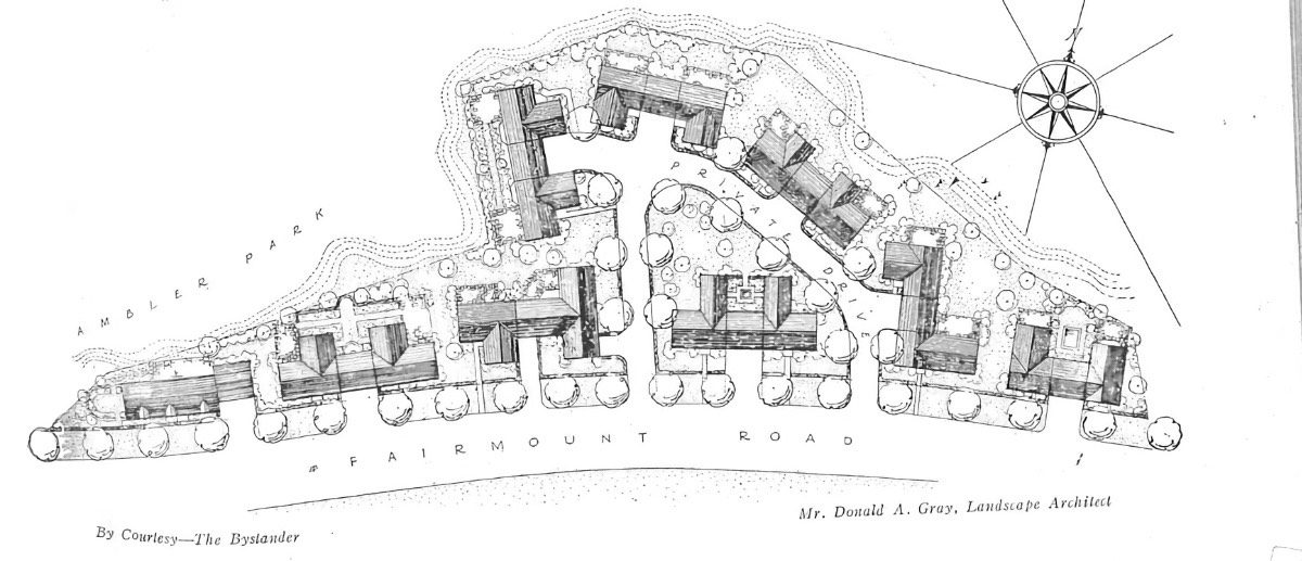 Fairhill's combination of private and shared space is a unique feature of the development. Each home accessed its private terraced garden while sharing a central park. This contrasts against other surrounding communities that prided themselves on large private homes and yards. The drawing shows plans for seventeen homes, but only ten homes were originally built. | Creator: A. Donald Gray | Date: April 1929 | Source: "Moving a Neighborhood," The Architectural Exhibitor.Download Original File
