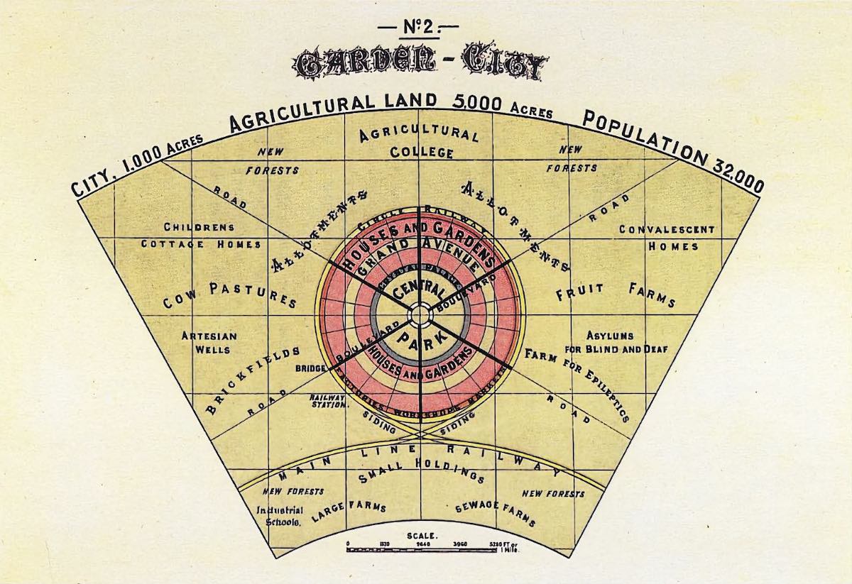 The Garden City was an attempt to counteract the social ills created by the overcrowding of urban centers. By creating a network of communities that were limited in size and population, the Garden City Movement attempted to reimagine urban planning for the benefit of its residents. Fairhill Road Village reflects this through a limited size, co-op model of living, and access to green space. | Date: 1898 | Source: Ebenezer Howard, Garden Cities of To-MorrowDownload Original File