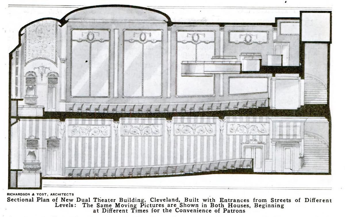 A cross-section view of the design plan for the Mall Theaters, showcasing their unique configuration. | Creator: Richardson and Yost, Architects | Date: May 1917 | Source: Popular Mechanics MagazineDownload Original File