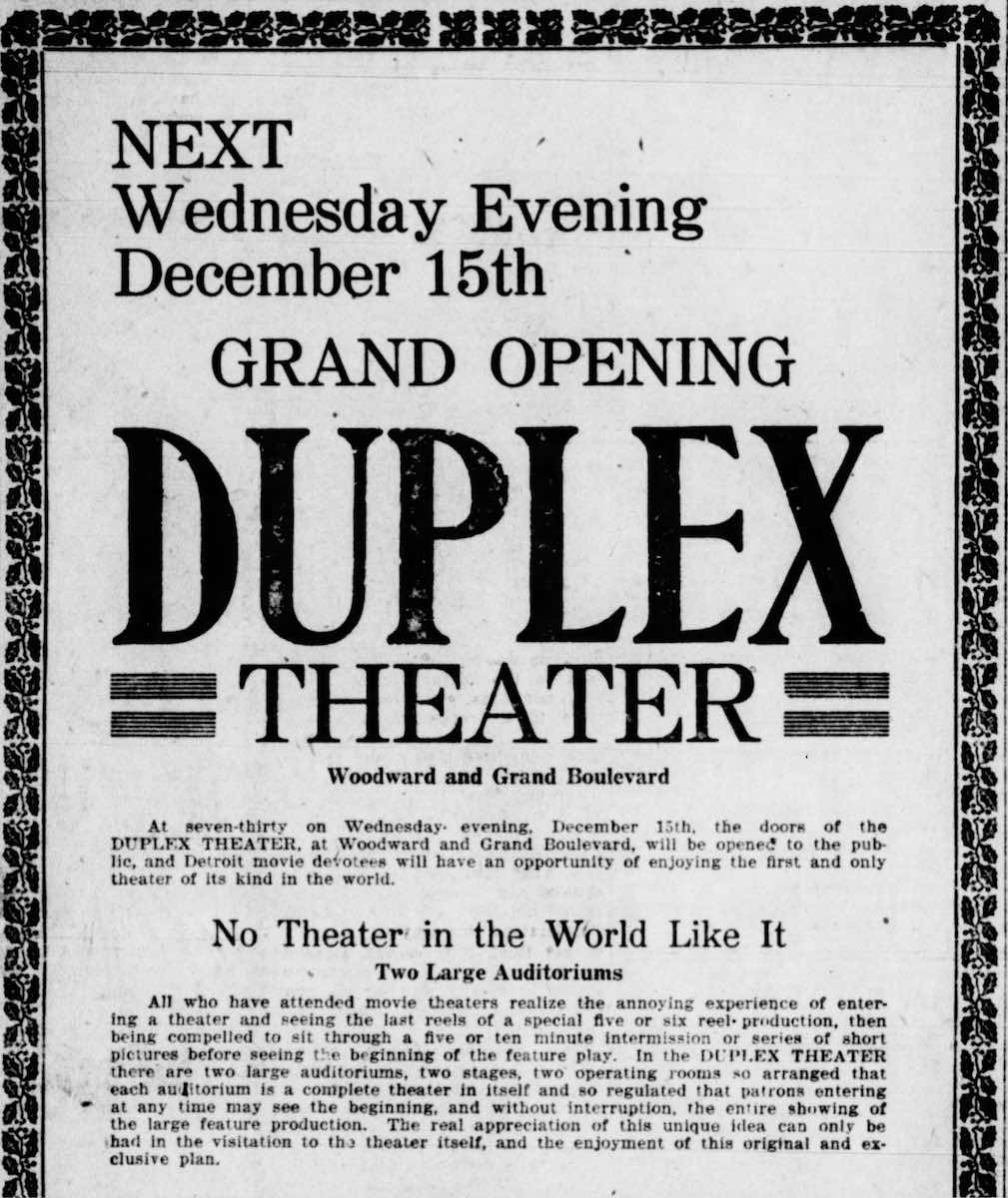 Newspaper advertisement for the Duplex Theater's grand opening. Describes the appeal of the newly established multiplex theater model. This disproves the Plain Dealer's claim the Mall was the first ever duplex theater, as it opened two years later. | Date: December 13, 1915 | Source: Detroit Evening TimesDownload Original File