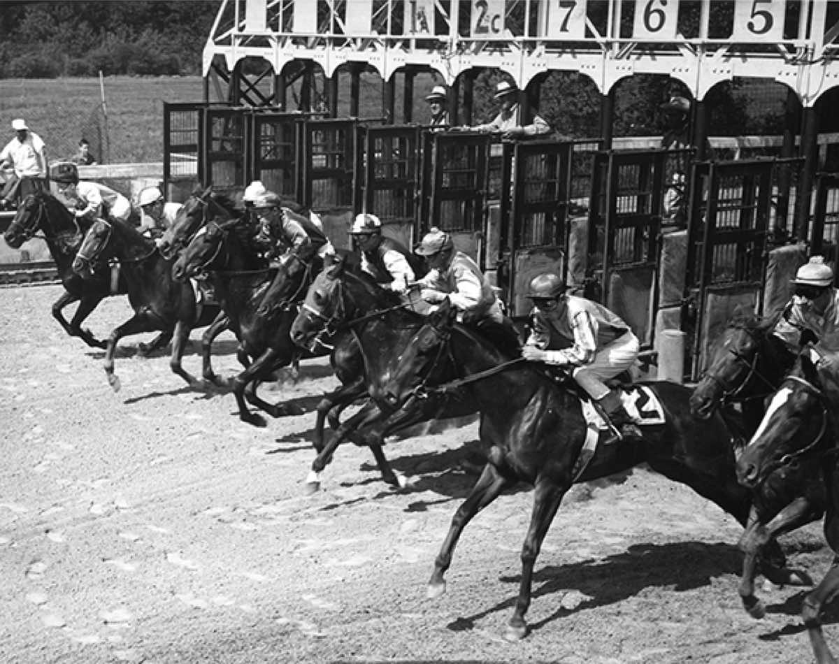 The starting stalls are opened as a horse race begins. | Date: June 13, 1956 | Source: Cleveland Press Collection, Michael Schwartz Library Special Collections at Cleveland State UniversityDownload Original File