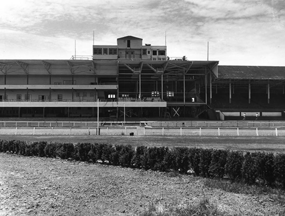 A wide-angle shot of the race track grandstand. | Date: July 11, 1951 | Source: Cleveland Press Collection, Michael Schwartz Library Special Collections at Cleveland State UniversityDownload Original File