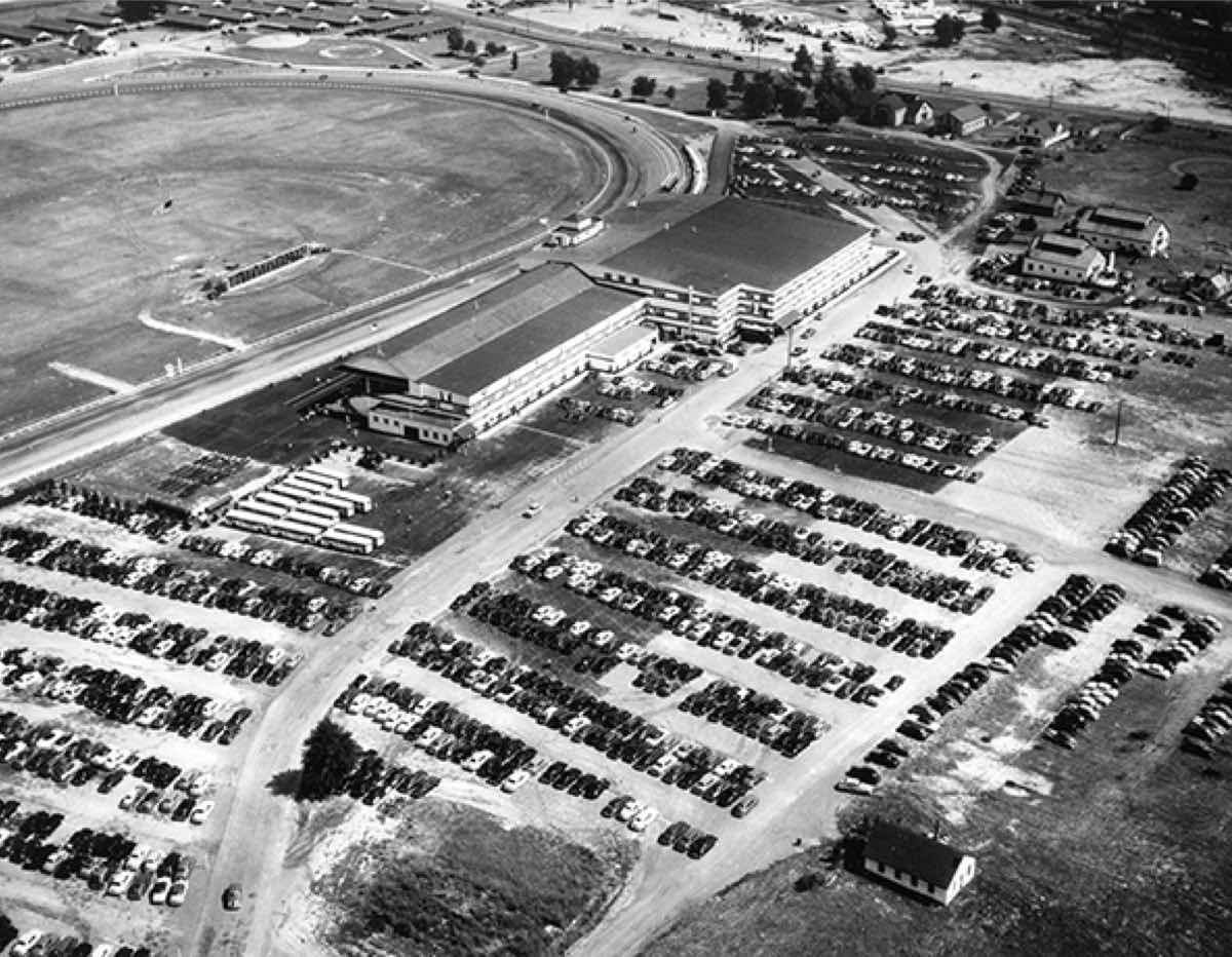 This aerial view shows how Randall Park, like other suburban destinations after World War II, depended on automobile access. Note how it is surrounded by parking. In earlier days, streetcars had carried spectators to the tracks. | Date: August 5, 1950 | Source: Cleveland Press Collection, Michael Schwartz Library Special Collections at Cleveland State UniversityDownload Original File
