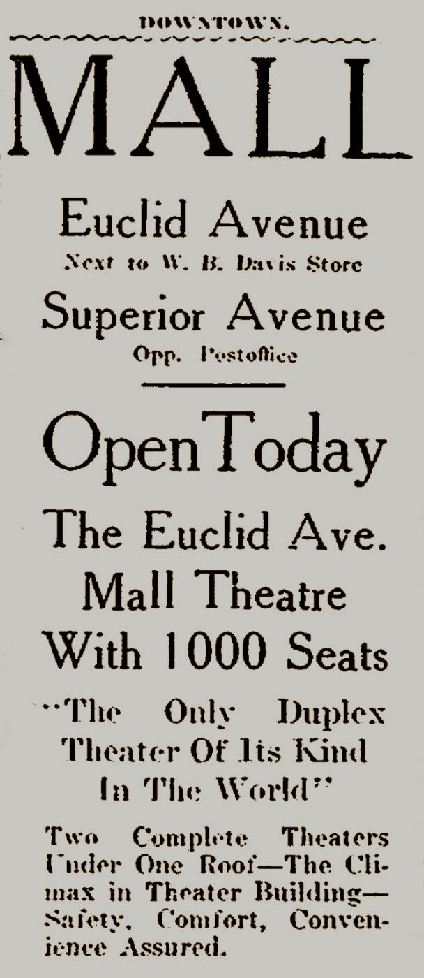 Plain Dealer Advertises Mall Theaters ID: 11568 | This file appears in: Mall Theaters This ad credits the Upper and Lower Mall as the "the only duplex theater of its kind in the world." | Date: March 17, 1917 | Source: Cleveland Plain Dealer Download Original File SourceCleveland Plain DealerDateMarch 17, 1917 "Plain Dealer Advertises Mall Theaters" appears in: Mall Theaters