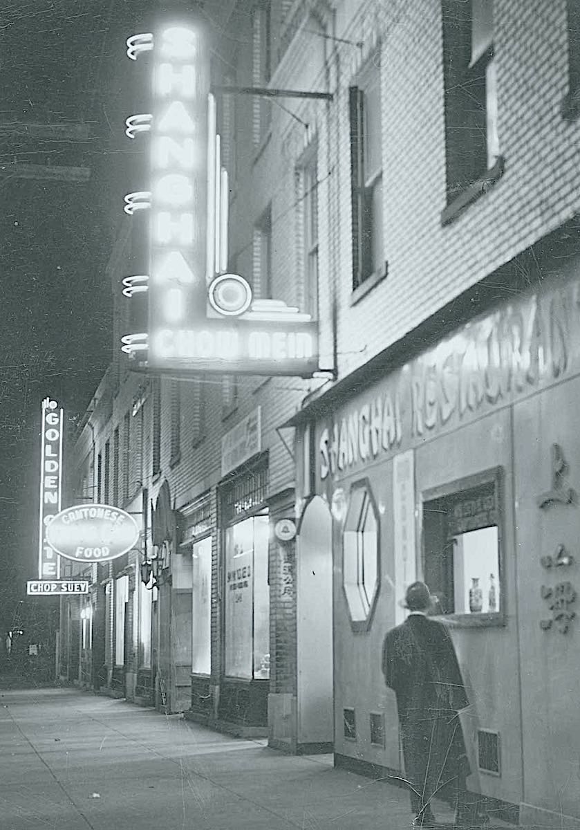 This nighttime view facing east along the south side of Rockwell Avenue shows the two largest businesses in that block in the mid-20th century: the Shanghai and Golden Gate restaurants. Chinatown was centered on Ontario Street into the late 1920s but was reestablished on Rockwell Avenue after 1930. | Creator: Lou Moore | Date: February 10, 1950 | Source: Cleveland Press Collection, Michael Schwartz Library Special Collections at Cleveland State UniversityDownload Original File