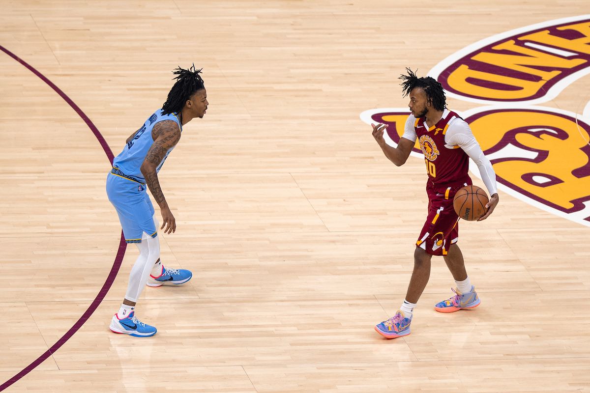 Cavaliers guard Darius Garland sets up the offense while guarded by Memphis Grizzlies guard Ja Morant in a regular season matchup at Rocket Mortgage FieldHouse. | Creator: Erik Drost | Date: January 4, 2022 | Source: Flickr, CC BY 2.0Download Original File