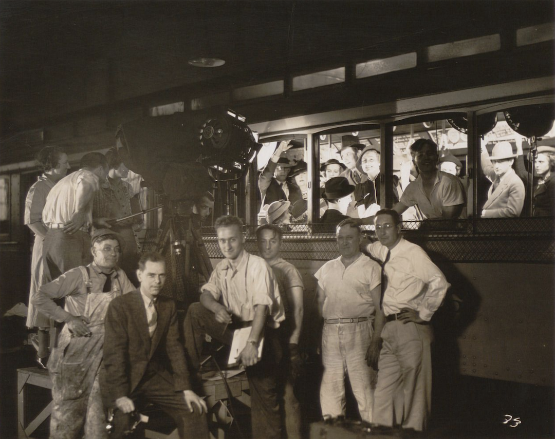 In 1939, Cinecraft Productions made its first industrial film, entitled "You Bet your Life." It was produced for the Cleveland Railway Co. to inform passengers how to ride safely on the company's street cars. This photo still from the film shows the cast of actors and film crew. If you look carefully, you can see director Ray Culley peering out from behind the camera. | Source: Hagley Museum and Library, Cinecraft Productions CollectionDownload Original File