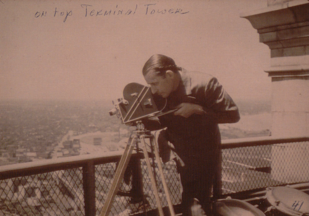Atop the Terminal Tower ID: 11683 | This file appears in: Cinecraft Productions Ray Culley is shown in this 1941 photograph filming a scene for an unidentified movie from atop the Terminal Tower in downtown Cleveland. | Source: Hagley Museum and Library, Cinecraft Productions Collection Download Original File SourceHagley Museum and Library, Cinecraft Productions Collection "Atop the Terminal Tower" appears in: Cinecraft Productions