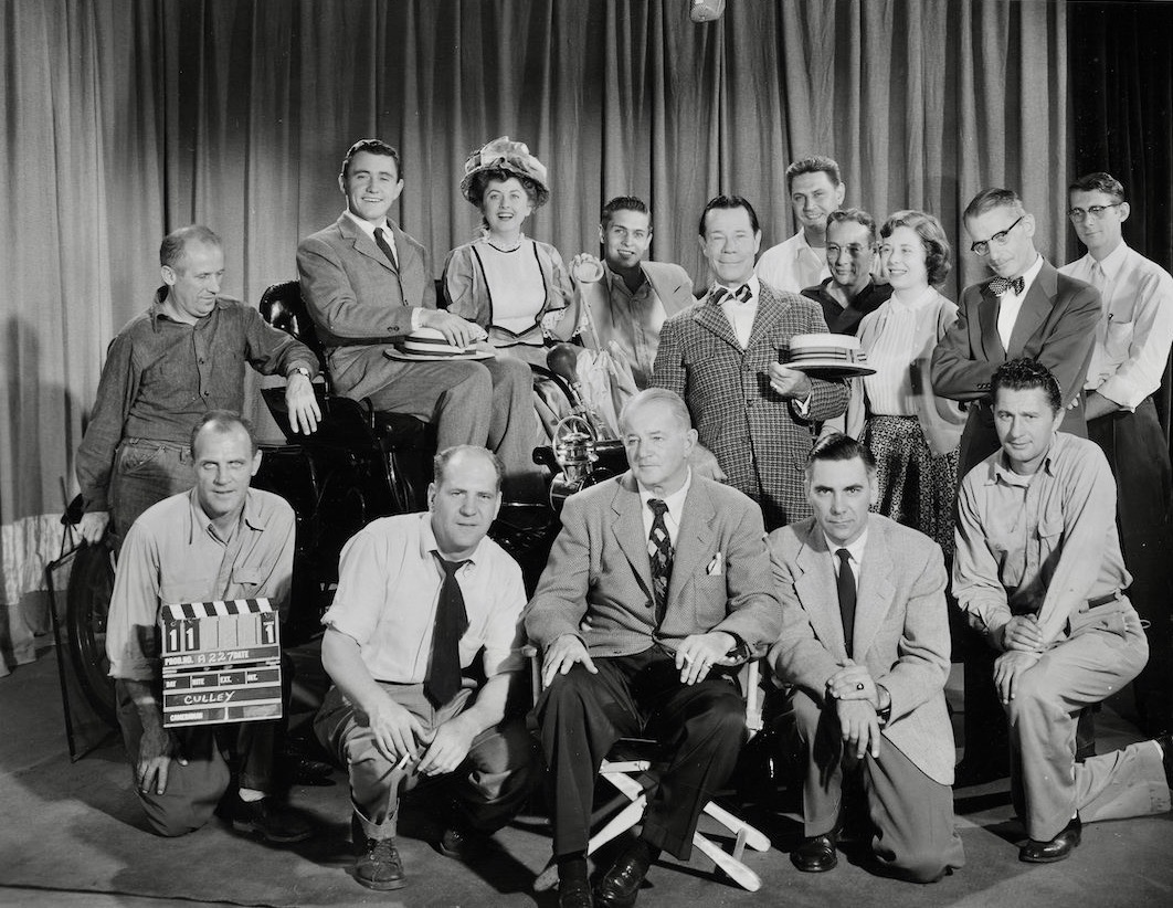 This photograph shows the cast and crew for the above titled industrial film which was produced by Cinecraft Productions in 1959 for Standard Oil of Ohio (Sohio), today British Petroleum Company (BP). Included in the cast were later long-time television show host Merv Griffin (top left sitting to the left of the woman wearing a flowery hat) and comedian Joe E. Brown, standing in the middle with straw hat in hand. Cinecraft Productions, Inc. owner and director Ray Culley (to the right with suit and bowtie) is also in the photo. | Source: Jim CulleyDownload Original File