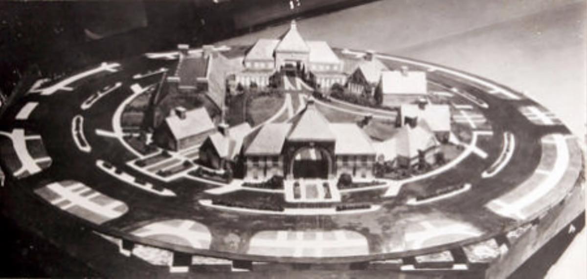 Before the Shaker Square design we know today, planners envisioned locating the commercial gateway to the Van Sweringens' suburb inside the existing Moreland Circle, a traffic circle (or roundabout) where South Moreland Boulevard, now Van Aken, branched off Shaker Boulevard. The plan shows how the rapid transit tracks would have passed through a tunnel-like opening in one of the buildings. The design would not have enabled sufficient parking and would have been incapable of the kind of expansion that eventually occurred to the east, west, and south of Shaker Square. | Source: Shaker Historical SocietyDownload Original File