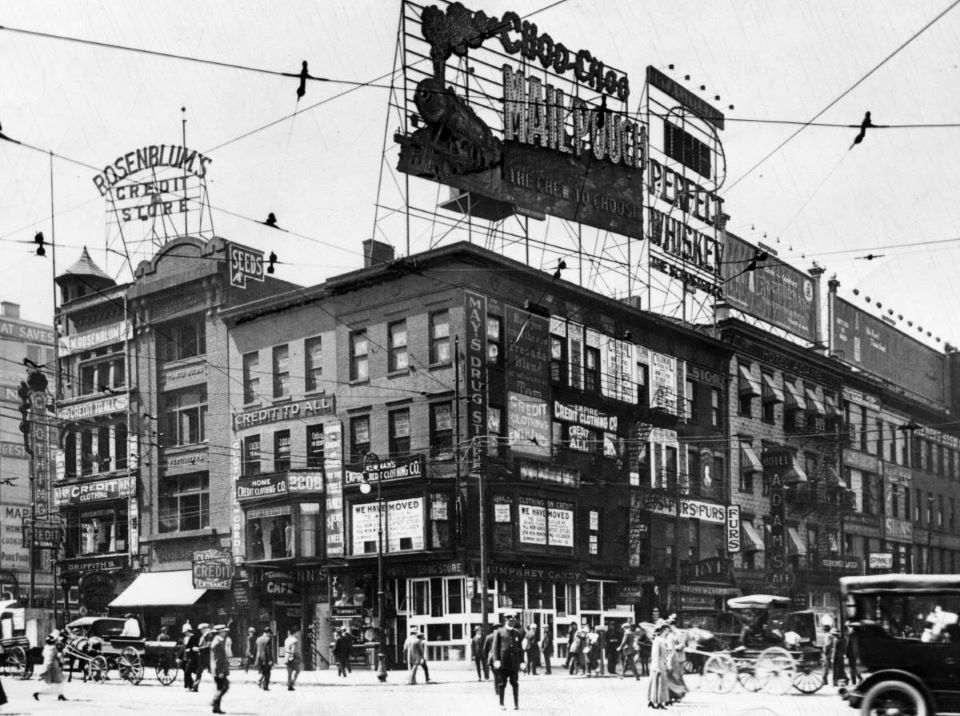 Seen on the left side of the image is Rosenblum's first store which was located on Public Square and opened in 1910. Rosenblum's Credit Store is displayed on a prominent sign above the building. | Date: 1920 | Source: Cleveland Public Library Digital GalleryDownload Original File