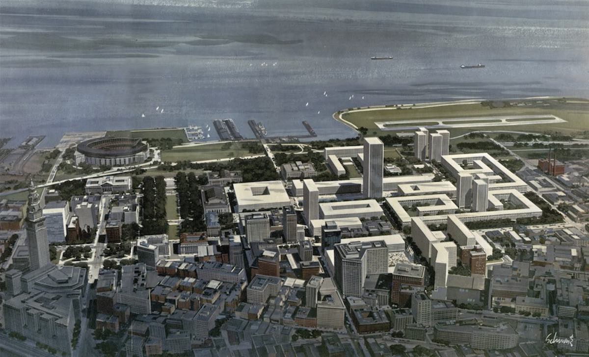 This rendering shows I.M. Pei’s original vision for the Erieview development. The large, low, square building at center-left is the federal building, which was to be 6-stories high. Instead of adhering to this concept, the design team opted for a tall building with an adjacent public plaza. | Creator: I. M. Pei & Partners | Date: 1961 | Source: MIT LibrariesDownload Original File