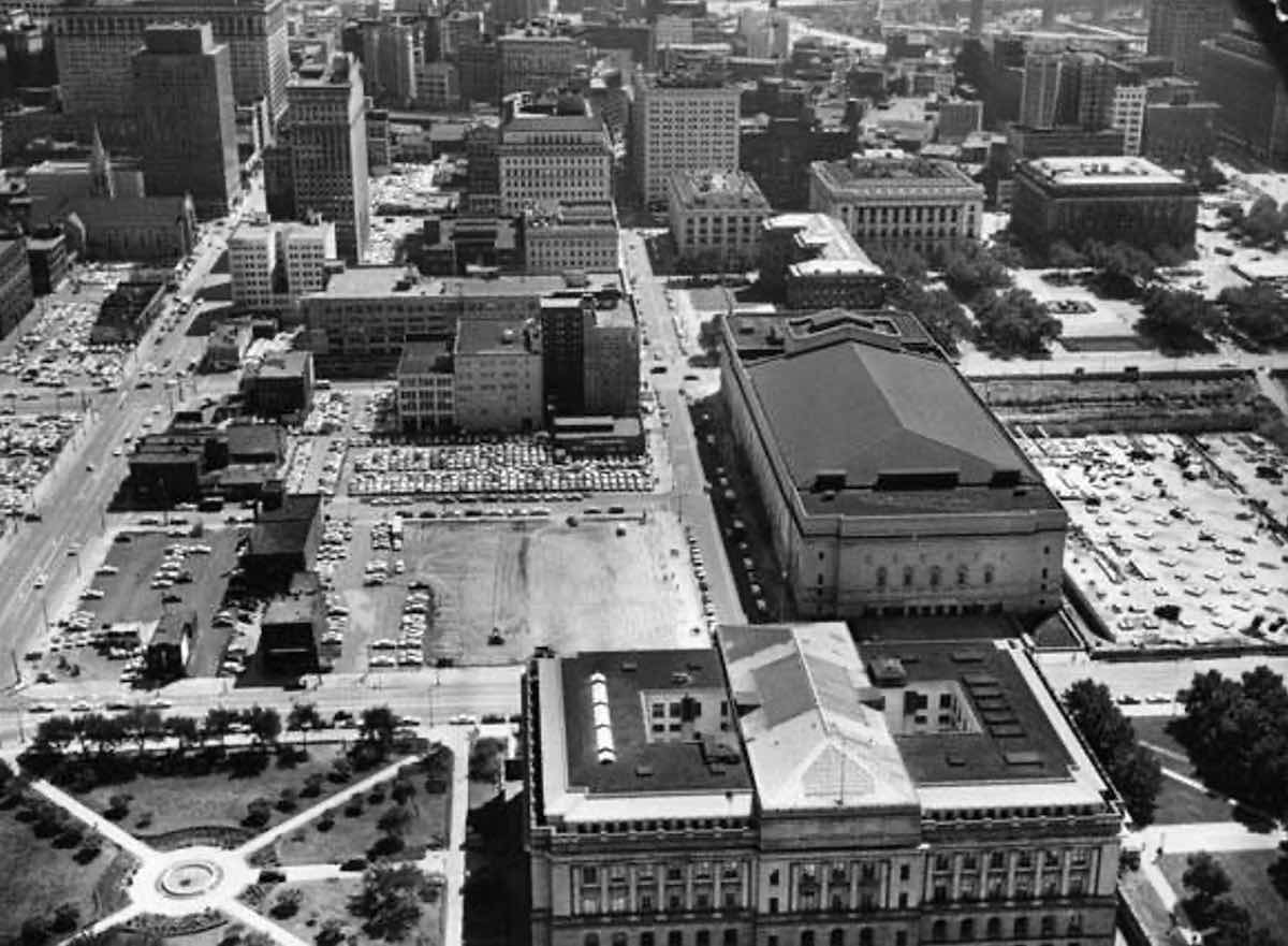 The mostly open block lot at the center-left of this photograph, taken just after the demolition of the Central Armory, is the future site of the Celebrezze Building and plaza. Willard Park and City Hall are visible at the bottom, and the Cleveland Public Auditorium is visible at center-right. | Creator: Jerry Horton | Date: 1962 | Source: Cleveland Memory, Michael Schwartz Library Special Collections at Cleveland State UniversityDownload Original File