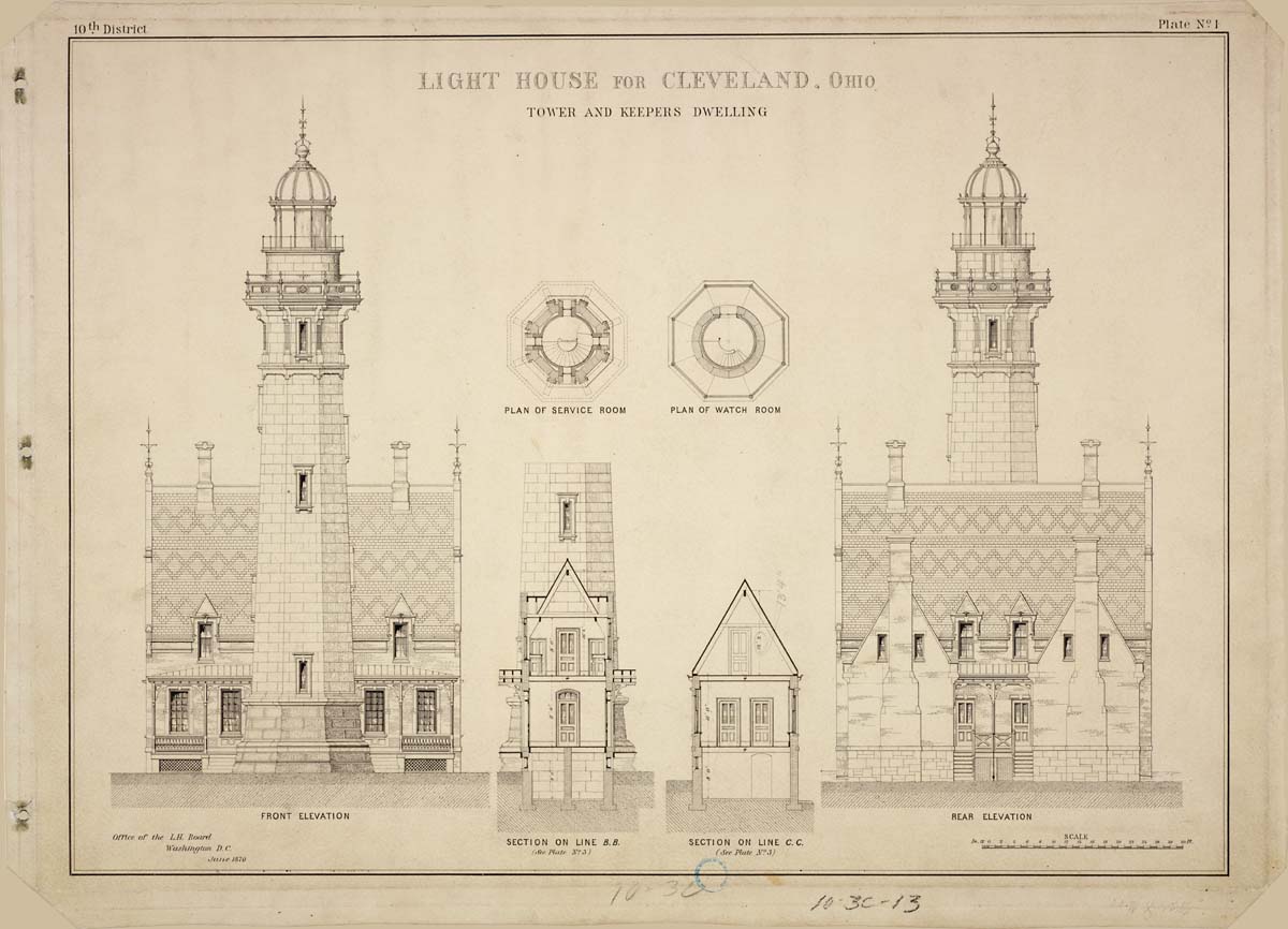 This architectural rendering of the proposed Cleveland Harbor Lighthouse shows the front and rear elevations and other details of the design. | Creator: Department of Commerce, Bureau of Lighthouses | Date: 1870 | Source: National Archives and Records AdministrationDownload Original File