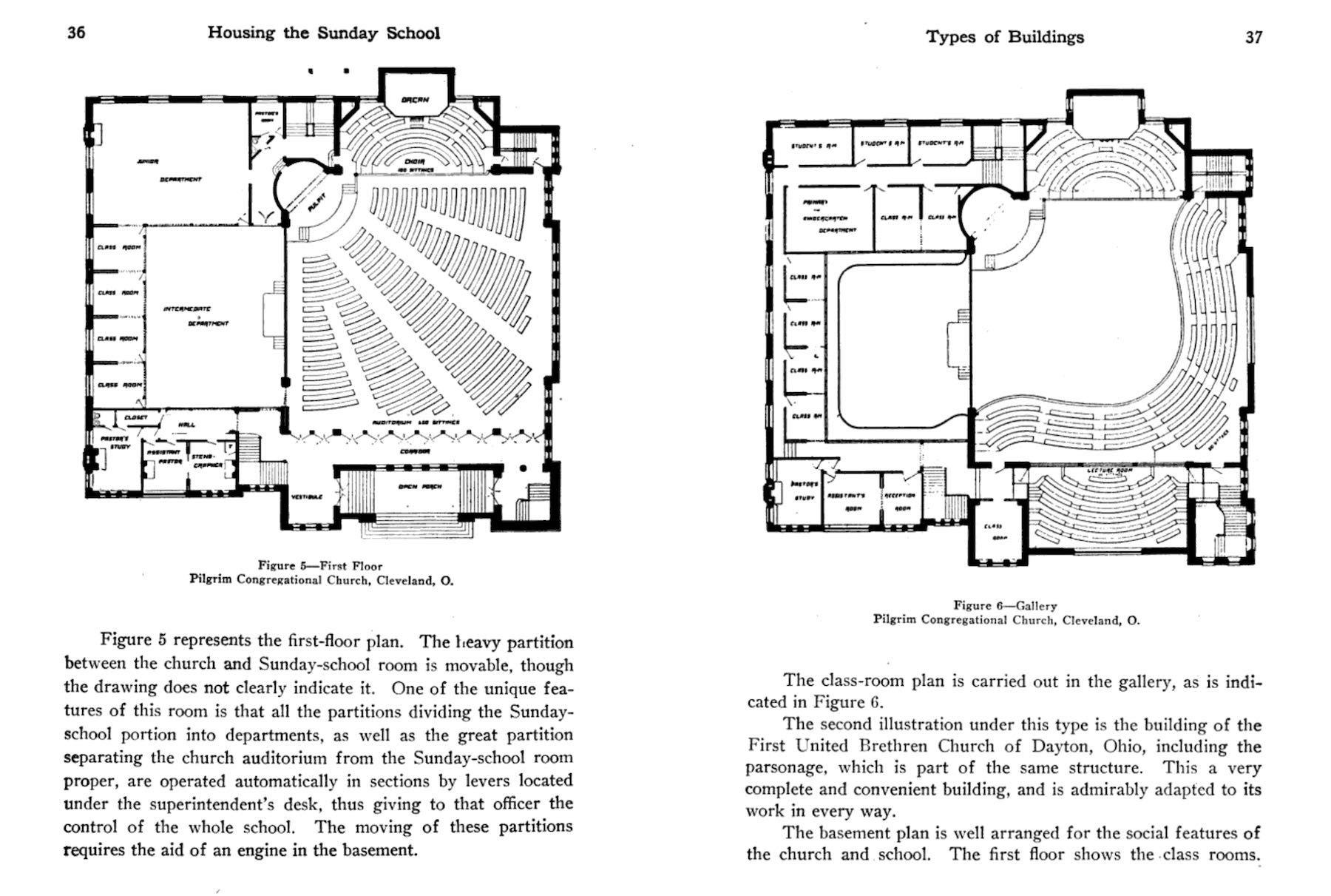 Pilgrim Church's Akron Plan ID: 11832 | This file appears in: Pilgrim Church These floor plans of the first and second floors show the compartmentalization of space by use of movable partitions powered by an engine located in the church's basement. | Source: Lawrance, Marion. Housing the Sunday School: Or, A Practical Study of Sunday School Buildings. Boston and Chicago: Pilgrim Press, 1911. 36-37. Download Original File SourceLawrance, Marion. Housing the Sunday School: Or, A Practical Study of Sunday School Buildings. Boston and Chicago: Pilgrim Press, 1911. 36-37. "Pilgrim Church's Akron Plan" appears in: Pilgrim Church