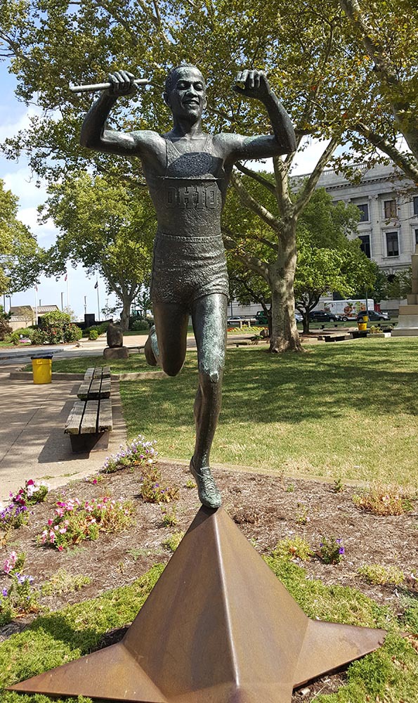 "Jesse Owens is one of the greatest athletes of the twentieth century. Apart from winning four gold medals at the 1936 Berlin Olympic Games in Nazi Germany, he is also known for breaking three world records and tying one in the span of 45 minutes at a Big Ten track meet in Ann Arbor in 1935. Part of Owens' legacy supersedes sports as well. He is known for having upset Hitler by completely destroying the narrative of Aryan supremacy by being a black man accomplishing historic feats of athleticism right in the capital of Nazi Germany." | Creator: William M. McVey | Source: Ohio Outdoor SculptureDownload Original File