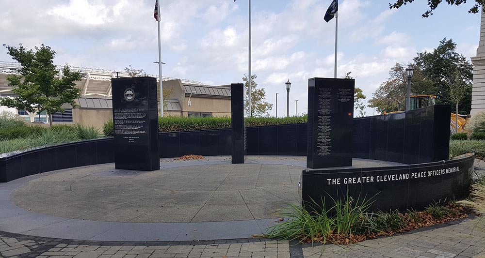 "A memorial plaza in Fort Huntington Park, consisting of benches, standing stones, and a rising curve, all made of polished black marble. Each part of the monument is imprinted with bold white text celebrating the sacrifice of the Greater Cleveland Police Officers, The imposing, reflective black slabs act as a colossal headstones memorializing the officers. The viewers can see themselves in the shiny surface of the rock, as a shadow behind the names; only able to view the monument because of the sacrifice of those named within." | Source: Ohio Outdoor SculptureDownload Original File