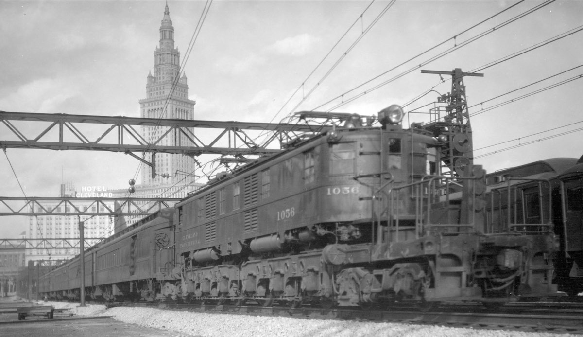 Engine #1056 pulls a westbound passenger train out of the Cleveland Union Terminal beneath electric catenaries. | Creator: Otto Perry | Date: September 27, 1930 | Source: Denver Public Library Special Collections, OP-6024Download Original File
