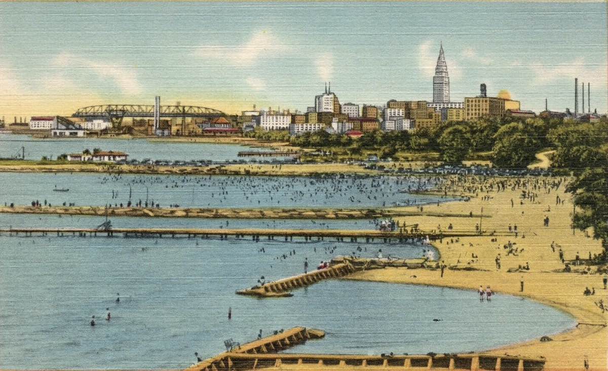 This postcard view faces east, providing a panorama of the beach with the Terminal Tower looming in the distance. | Creator: Braun Art Publishing Co. | Date: ca. 1940s | Source: Cleveland Memory Project, Cleveland State University Library Special CollectionsDownload Original File