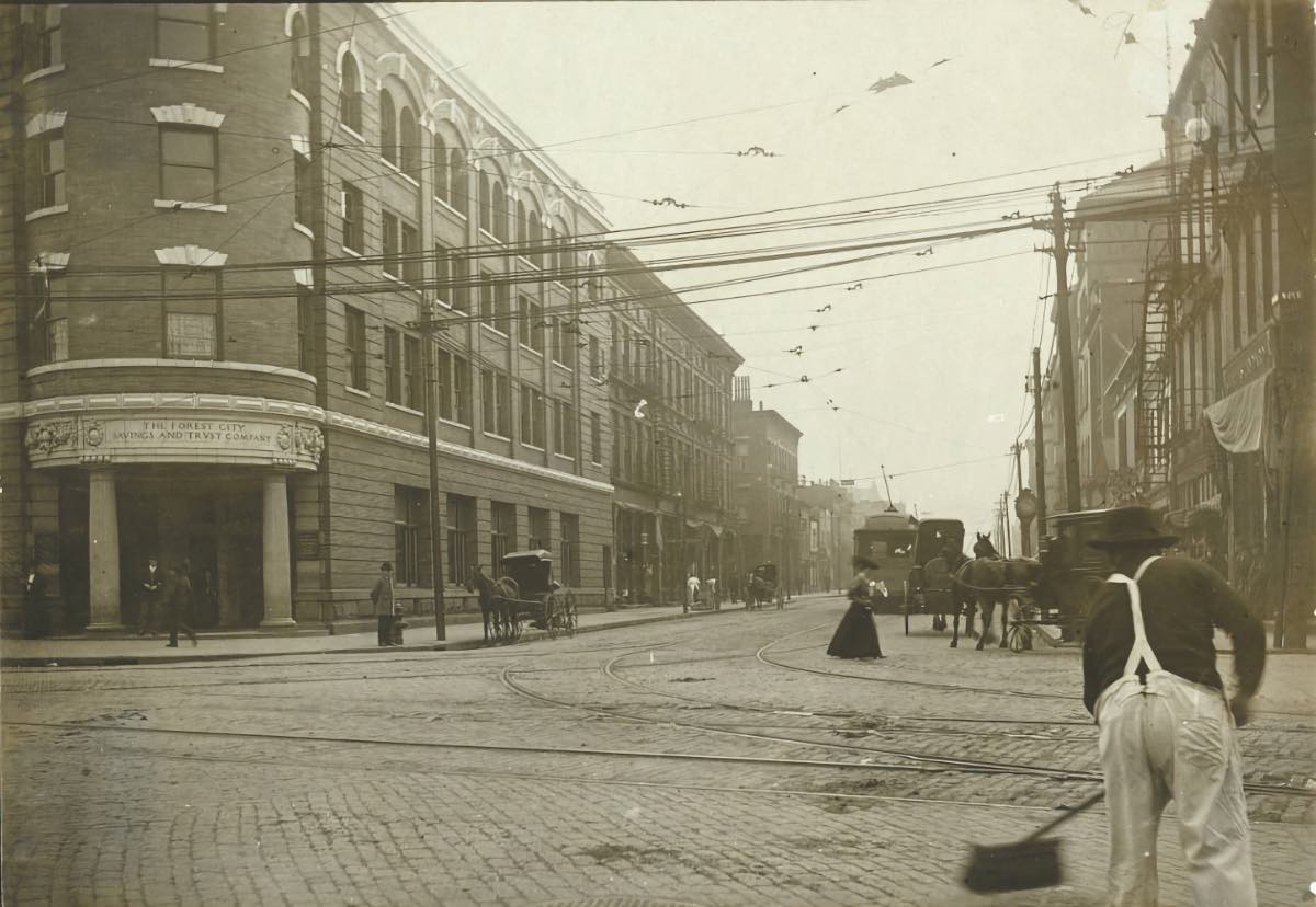 A 1909 view of the intersection of West 25th and Detroit Avenue, looking west on Detroit from West 25th. Jimmy Dunn's Gym at 2618 Detroit would have been a few buildings down the street on the right. This would have been the training neighborhood of featherweight champion Johnny Kilbane who trained out of Dunn's Gym in 1912, the year he won his title. | Date: 1909 | Source: Cleveland Public Library, Photograph CollectionDownload Original File