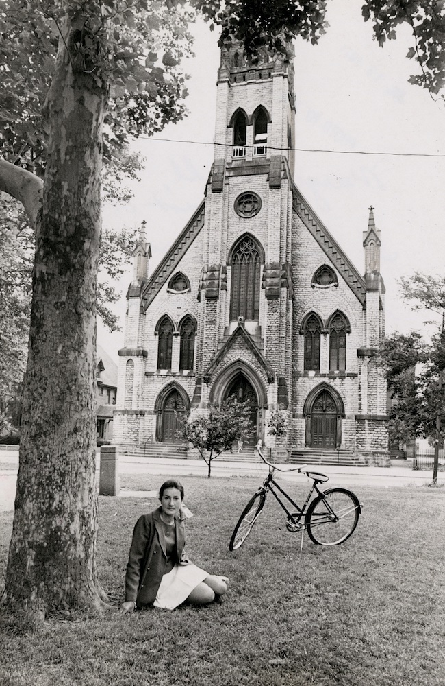 Margie Kahl, a secretary at the Wall Street Journal, enjoys the park setting at Carnegie West Library, with St. Patrick Church shown prominently in the background. | Date: June 13, 1971 | Source: Cleveland Public Library, Digital Photograph CollectionDownload Original File