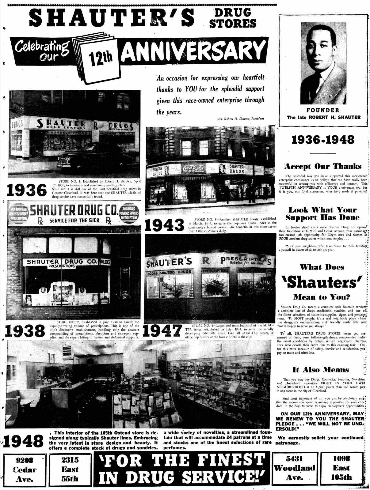 Pierson helped pharmacist Bob Shauter purchase the former Fox Pharmacy at 9208 Cedar Avenue in 1936. The business expanded into a four-store drugstore chain, the city's first to be owned by an African American. Note the 1943 opening in the Reserve Building, another Pierson venture. | Date: April 3, 1948 | Source: Call & PostDownload Original File