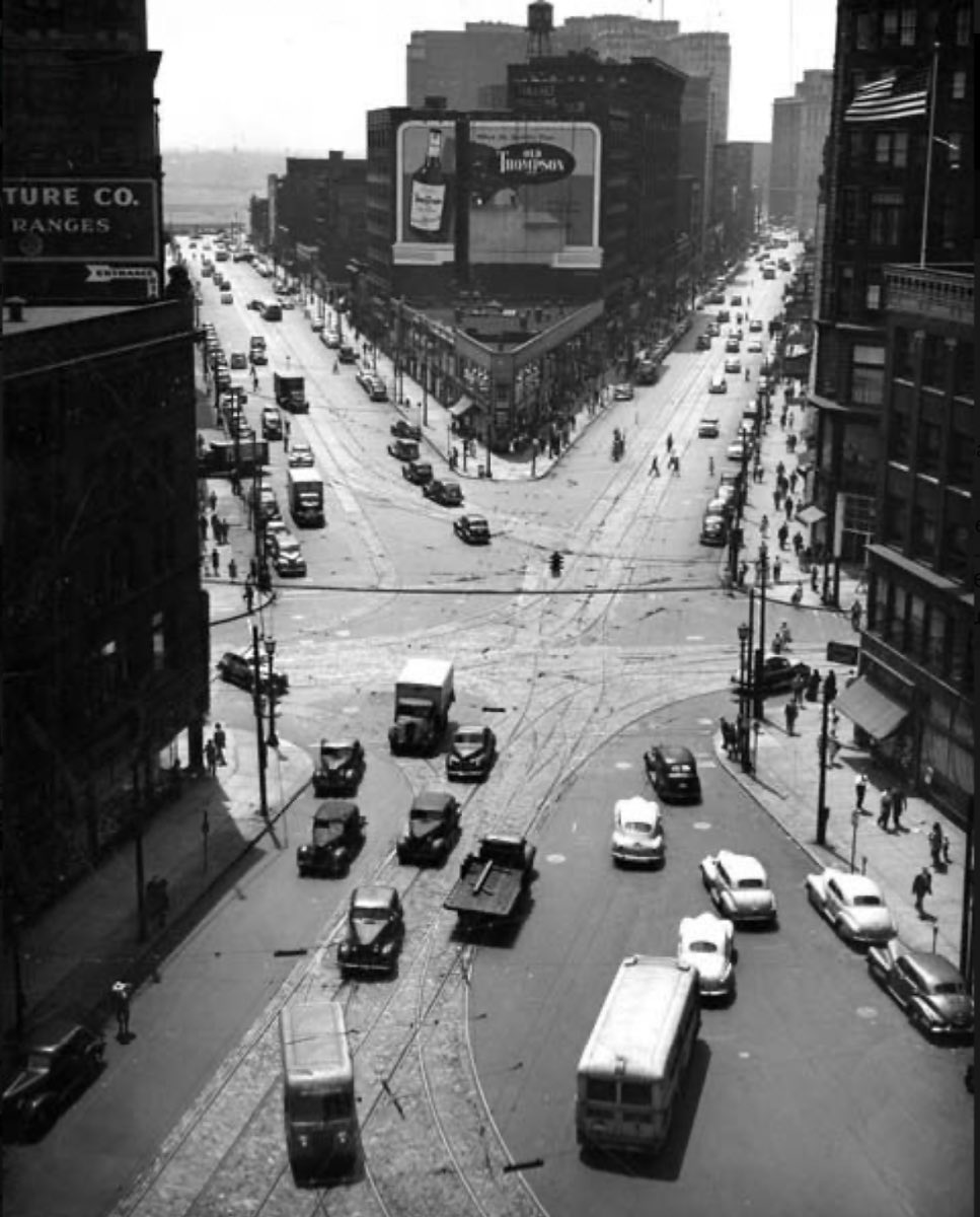 In this bird's-eye view from the top of the Osborn Building, the Rose Building is barely visible on the far right corner. The density of development shows that Benjamin Rose's designation of the intersection as "The New Center" was prescient. | Creator: Gary Brookins | Date: ca. 1945 | Source: Cleveland Memory, Michael Schwartz Library Special Collections at Cleveland State University Download Original File