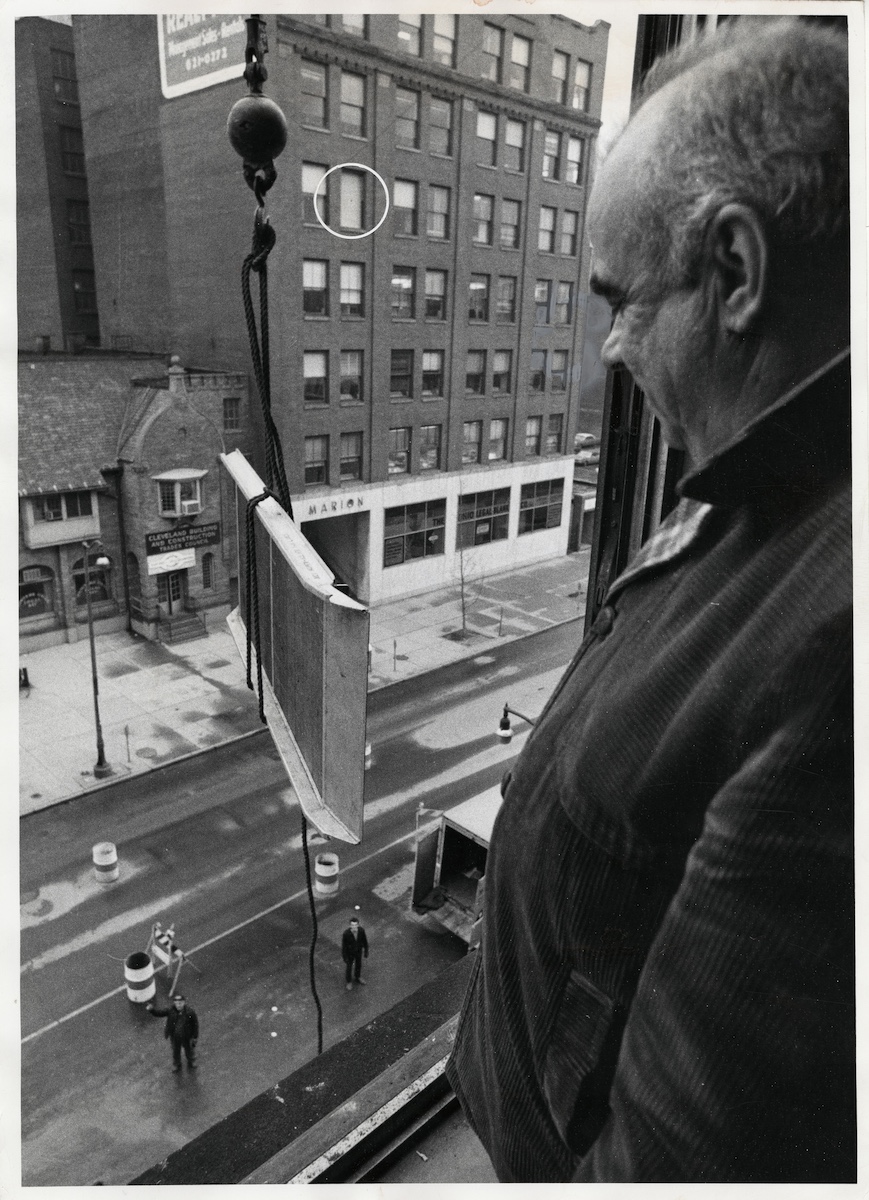 Paul Rodriguez of Rodriguez and McGilly Movers watches a crane lifting a skid to an upper floor of the Watson Building, which was scheduled for demolition. In the background, the Bertsch Building, with a sign indicating it was then home to the Cleveland Building and Construction Trades Council. | Date: 1972 | Source: Cleveland Public Library, Photograph CollectionDownload Original File