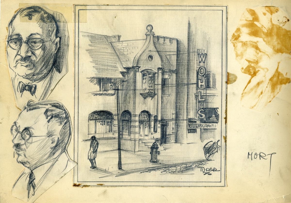This illustration shows brothers Alexander and Julius Wohl, owners of Wohl's Hungarian Restaurant, and the exterior of the restaurant at 1280 West 3rd Street. | Date: 1928 | Source: Cleveland Press Collection, Michael Schwartz Library Special Collections at Cleveland State UniversityDownload Original File