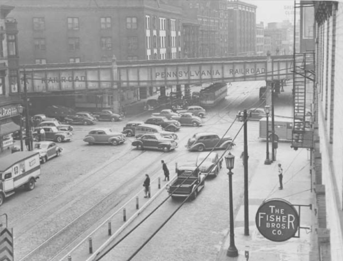 Looking east on Euclid towards the East 55th Street intersection, you can see the bridge that had been constructed over the roads in an attempt to alleviate traffic through the intersection. | Date: 1941 | Source: Cleveland Memory, Michael Schwartz Library Special Collections at Cleveland State UniversityDownload Original File