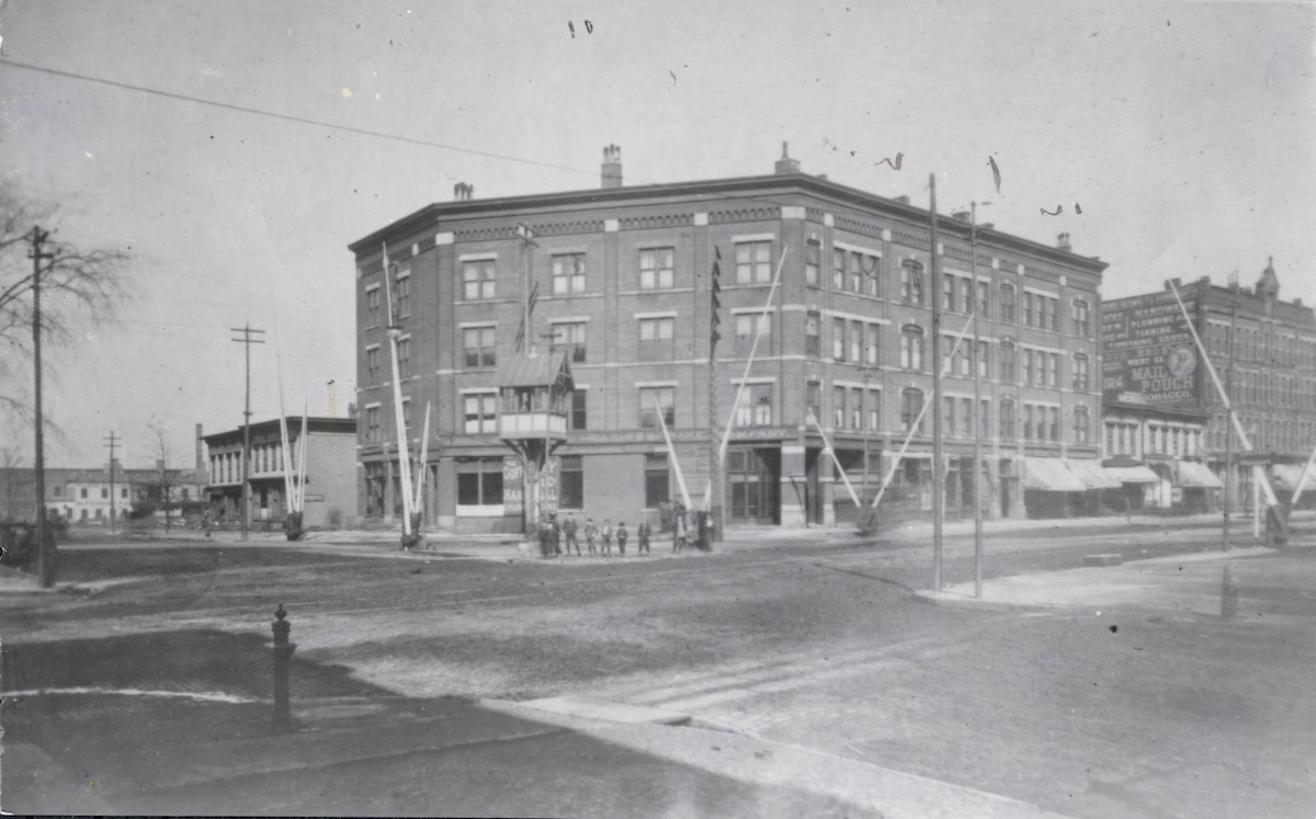 This photo shows the Pennsylvania Railroad crossing at prior to the elevation of the tracks. The Quinby Building was on the northeast corner of the intersection of Euclid and East 55th. The railroad gates and a watch tower are visible in the intersection. | Date: 1906 | Source: Cleveland Public Library, Photograph CollectionDownload Original File