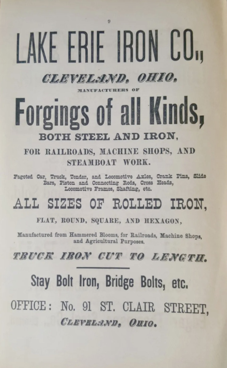 Cleveland Directory advertisement for Lake Erie Iron Company ID: 12141 | This file appears in: The Grand Arcade Date: 1877 | Source: Cleveland Public Library, Digital Directory Collection Download Original File SourceCleveland Public Library, Digital Directory CollectionDate1877 "Cleveland Directory advertisement for Lake Erie Iron Company" appears in: The Grand Arcade
