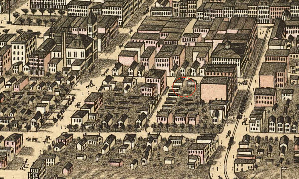 Circled area is where Grand Arcade would be built in a few years. The building to the right of the site is the Waring Block, which was built in 1855. Like the Grand Arcade, it is still standing today. | Date: 1877 | Source: Library of Congress Prints and Photographs DivisionDownload Original File