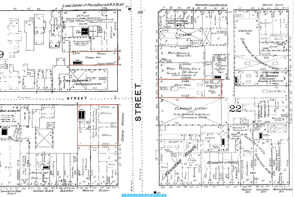 "Sanborn map view of three buildings on St. Clair Avenue owned by members of the William C. Scofield family in the nineteenth century." appears in: The Grand Arcade