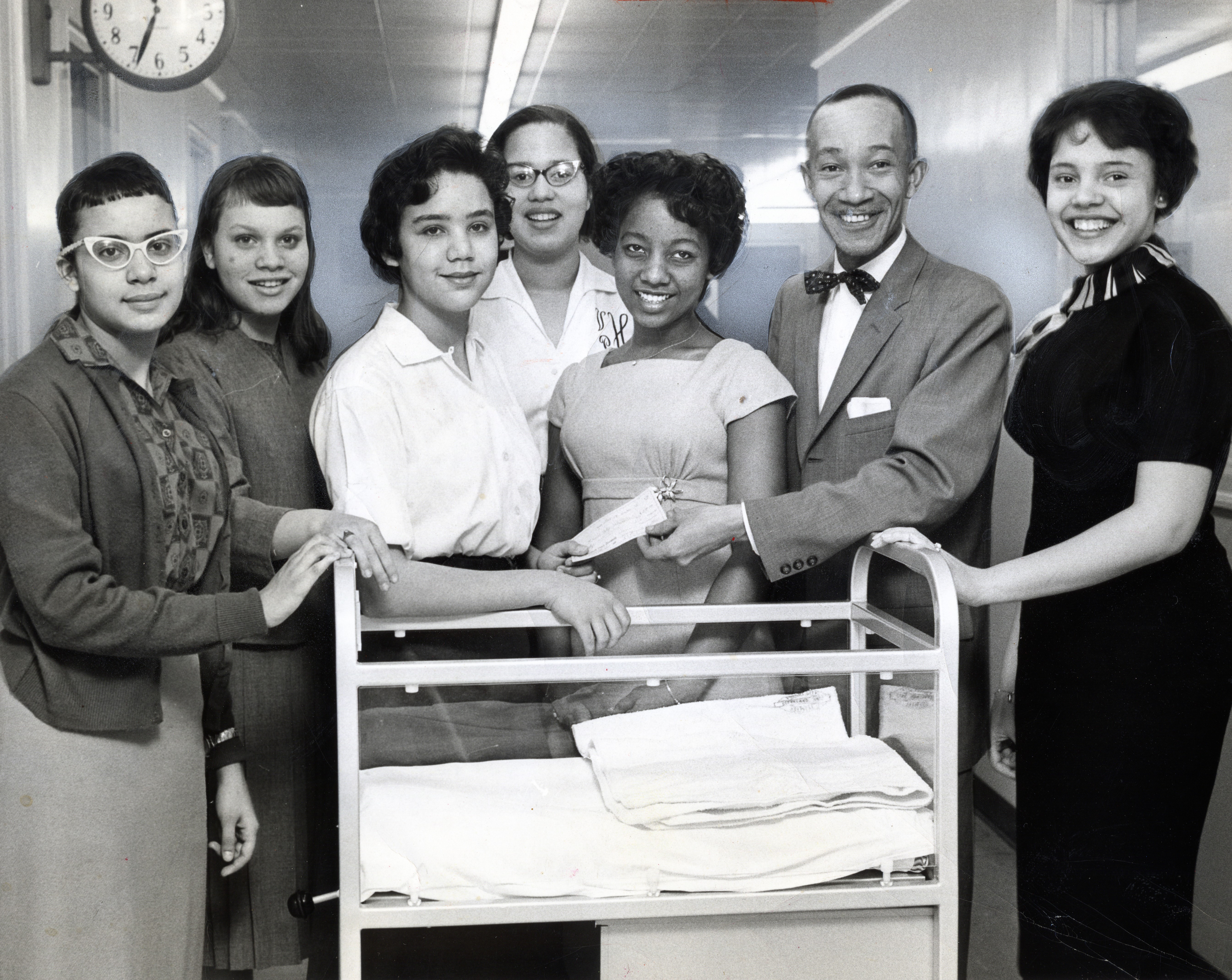 Forest City was viewed as a location where those hoping to work in the medical field could find stable employment without the risks of being discriminated against based on race. Names of staff pictured from left to right: Donna George, Pay Richardson, Margie Suler, Virginia Hughes, Janice Green, William Andrews, Joyce Hemns. | Date: 1960 | Source: Cleveland Press Collection, Michael Schwartz Library Special Collections at Cleveland State UniversityDownload Original File