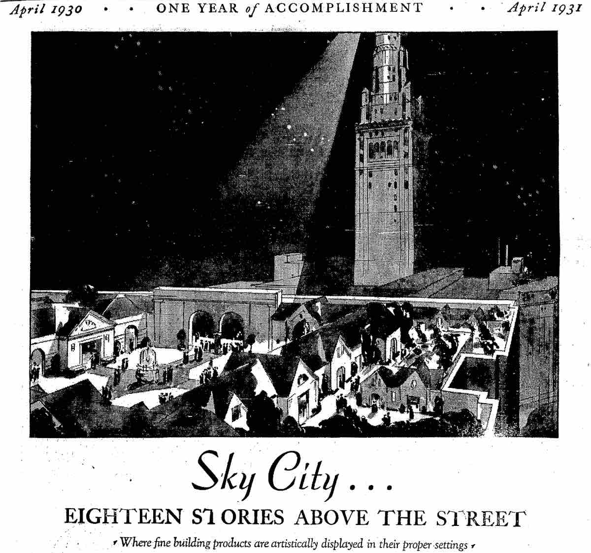 Sky City was a 1931 addition to the Builders Exchange's exhibits around the Home in the Sky. It was essentially a village with smaller buildings that served as display rooms showing various furnishings and materials in context. It enabled more space for this purpose than was possible in the house itself. | Date: April 5, 1931 | Source: Plain Dealer Archives / Cleveland Public Library Download Original File
