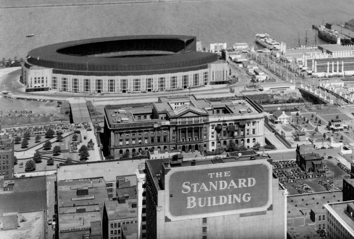 The Home in the Sky was only the first of half a dozen demonstration homes constructed in downtown in the 1930s. Two others, the Halle House and a smaller demonstration house immediately to its south, appear in this aerial photo of the Great Lakes Exposition just east (right) of the Cuyahoga County Courthouse. | Date: 1936 | Source: Cleveland Public Library, Photograph CollectionDownload Original File