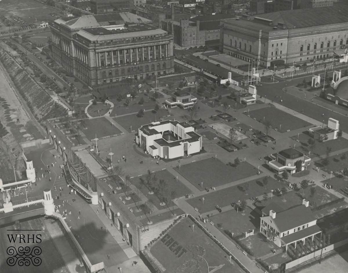 In this aerial view of a portion of the Great Lakes Exposition, the replica of James A. Garfield's log cabin appears in the distance on the near (west) side of City Hall. The Halle House appears at lower right. | Date: 1936 | Source: Western Reserve Historical SocietyDownload Original File