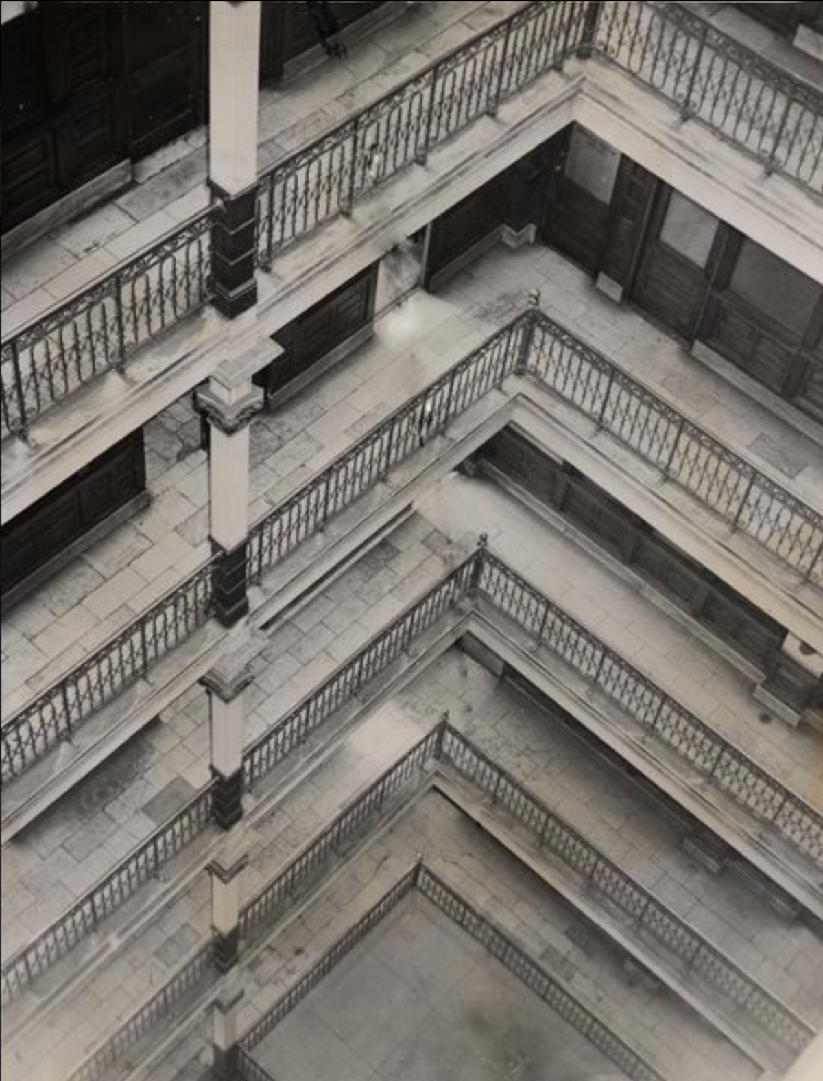 One of the special features of this grand building—which no longer exists today—was the interior court, which provided interior access and lighting for tenants with office windows and doors overlooking it. | Date: May 8, 1953 | Source: Cleveland Press Collection, Michael Schwartz Library Special Collections at Cleveland State UniversityDownload Original File