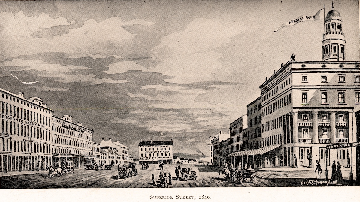 This illustration, created by artist Norval Jordan in 1896, purports to show Superior Avenue, west of Bank (West 6th) Street in the year 1846. The first four buildings portrayed on the right side of the illustration are the Weddell House, the Johnson House, the Crittenden Building, and the Franklin House. The remainder of the buildings shown on the north side of Superior are likely representative of the Central Buildings and perhaps another block that preceded the building of the Plain Dealer Buildings in 1847. | Creator: Norval Jordan | Date: 1846 | Source: Cleveland Press Collection, Michael Schwartz Library Special Collections at Cleveland State UniversityDownload Original File