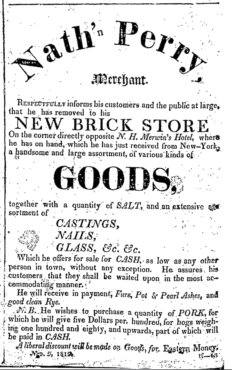 This advertisement in the December 14, 1819 Cleveland Register invites Clevelanders to shop at Nathan Perry's new store on the northeast corner of Superior and Water (W. 9th) Streets. The building was one of Cleveland's first brick buildings. | Source: Pulling Up Roots, Book Two, by Christopher Eiben, at page 204.Download Original File