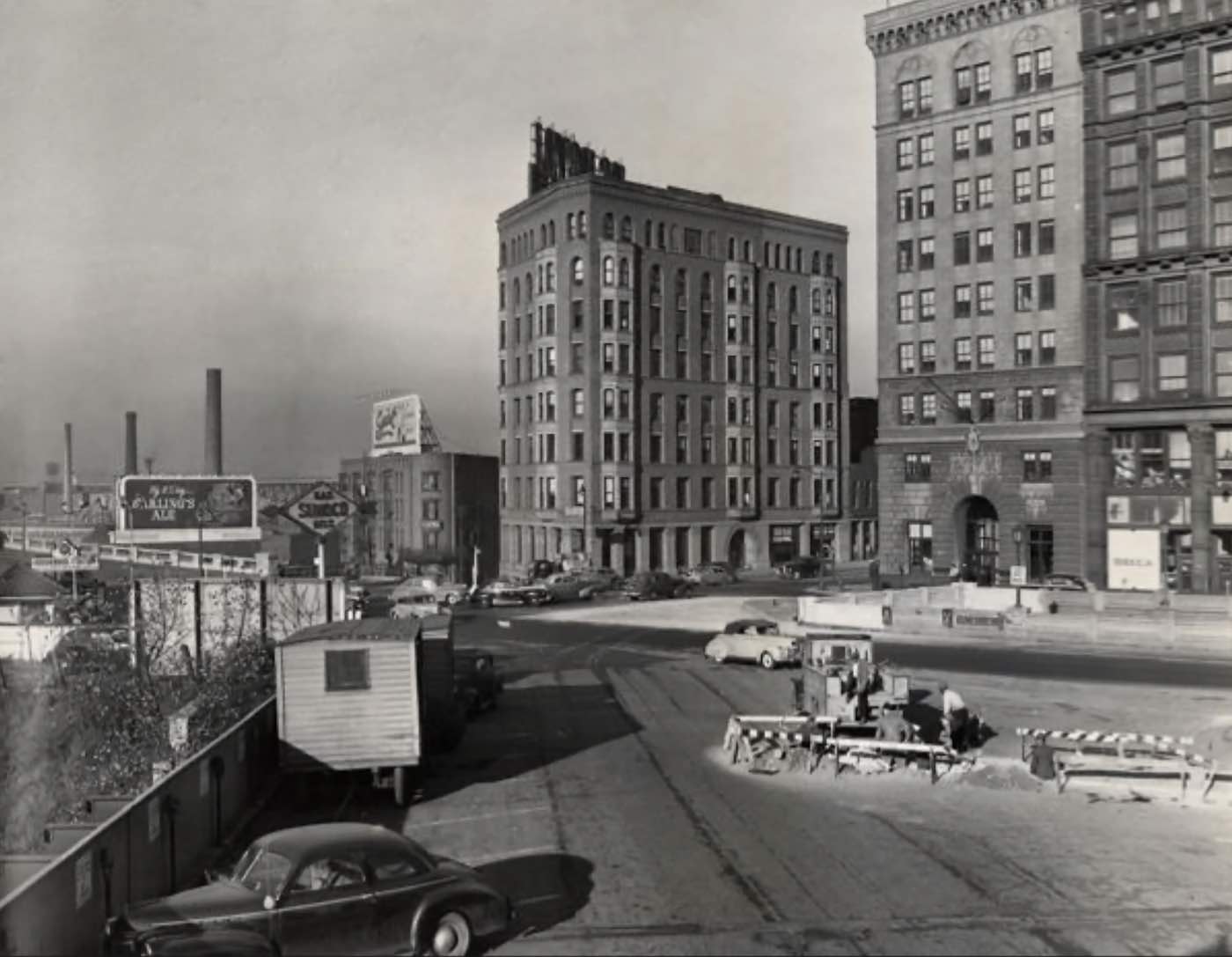 This photo shows how the building appeared after its 1903 addition, which is the portion to the right of the Romanesque entry arch that marked the right side of the original building. To the right, across West 9th, is the Brotherhood of Railroad Trainmen Building and, at far right, the Perry-Payne Building, where Pickands, Mather & Co. had previously been headquartered. | Creator: Clayton Knipper | Date: October 27, 1947 | Source: Cleveland Memory, Michael Schwartz Library Special Collections at Cleveland State University