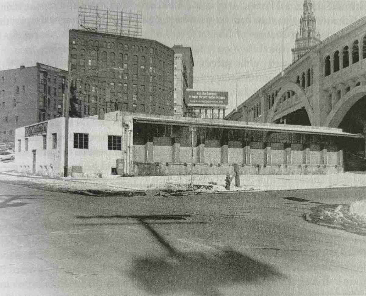 The abandoned truck terminal in the foreground was turned into a discotheque called the Cleaveland Crate & Truckin' Company as part of Higbee's investment in the Flats in the early 1970s. The company's broader vision for Settlers' Landing, Cleveland's answer to San Francisco's Ghirardelli Square, included the Western Reserve Building, but the project failed, contributing to the weakening of Higbee's even as it helped lay the groundwork for the eventual redevelopment of the Warehouse District. | Date: 1972 | Source: Cleveland Press Collection, Michael Schwartz Library Special Collections at Cleveland State UniversityDownload Original File