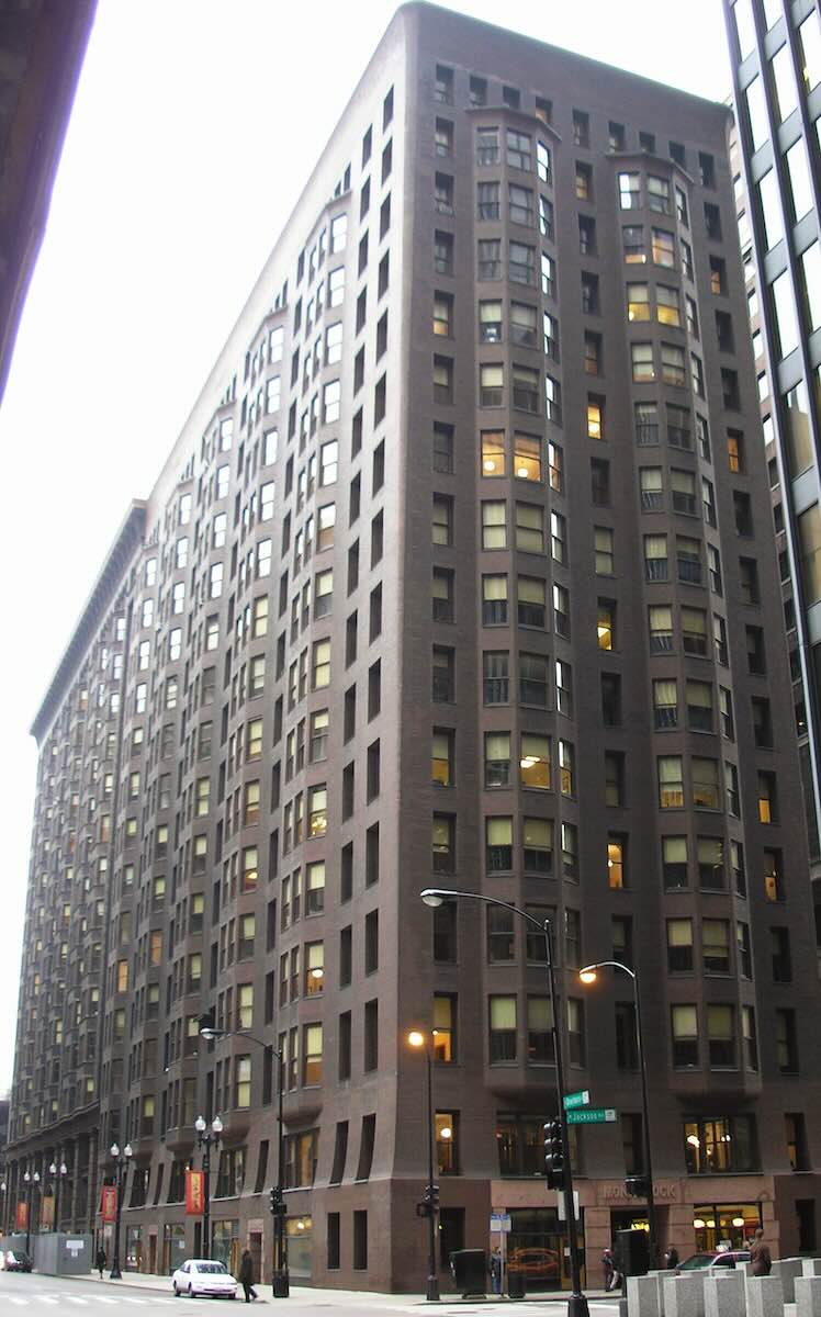 Chicago's Monadnock Building, completed one year before the Western Reserve Building, was also designed by Burnham & Root. Both buildings share load-bearing masonry exterior walls, although both have some interior iron structural supports, marking them as transitional buildings in terms of construction technologies. At 16 stories, the Monadnock Building was the tallest building ever built with load-bearing masonry walls. Its walls are six feet thick on the first floor. | Creator: David K. Staub, CC BY-SA 2.5 | Date: December 30, 2005 | Source: Wikimedia Commons
