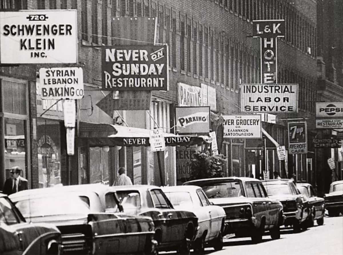 Notable businesses in this photo of the Bradley Building include Syrian Lebanon Baking Co., Never on Sunday Restaurant, Averoff Cafe, Middle East Restaurant, and Acropolis Cafe. The Bradley Building also contained the L&K Hotel, a single-room-occupancy hotel of the type that once housed the extremely poor before they were destroyed with the encouragement of influential downtown leaders. The Bradley Building was razed in 1973 for a parking lot. Today it is a parking garage serving games and events in the Gateway District. | Creator: Larry Nighswander | Date: 1970 | Source: Cleveland Memory, Michael Schwartz Library Special Collections at Cleveland State UniversityDownload Original File