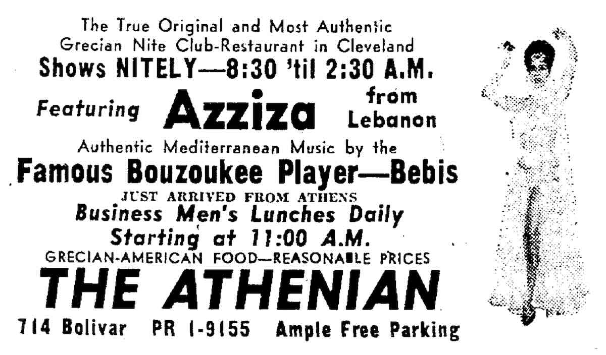 The Athenian, once a Greek coffee house, opened in 1964. Mixing Americanized Greek food with belly dancing and bouzouki music, the Athenian attracted lunchtime crowds from downtown office buildings and suburban couples in the evenings with its promise of "ample free parking." Within a decade, it too would become parking but for a price. | Date: March 25, 1966 | Source: Cleveland Plain DealerDownload Original File