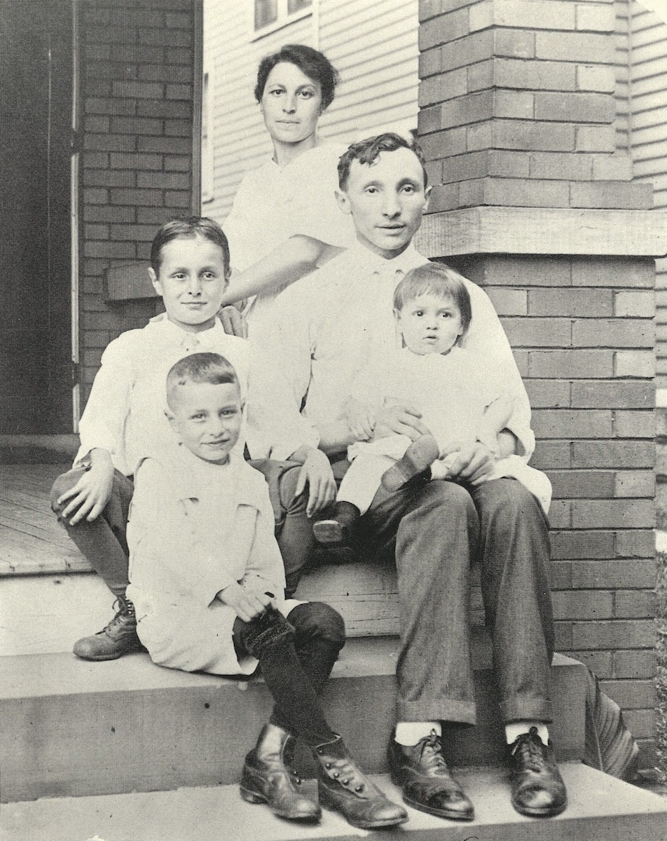 Pictured in this photo are Jacob and Jennie Sapirstein and their three sons, Irving, Morris and Harry. The photo was taken at 856 East 95th Street in Cleveland's Glenville neighborhood. (Not included in the family photo is daughter Bernice, who was born several years later.) This house, in which the Sapirsteins lived from 1918 to 1919, is no longer standing. | Date: 1918 | Source: Cleveland State University Special CollectionsDownload Original File